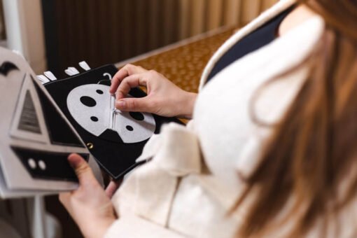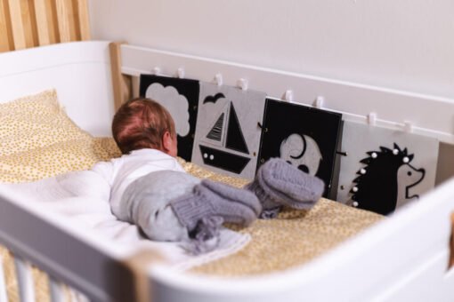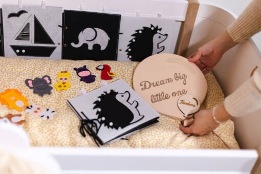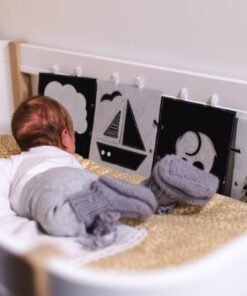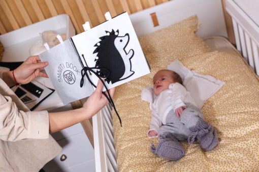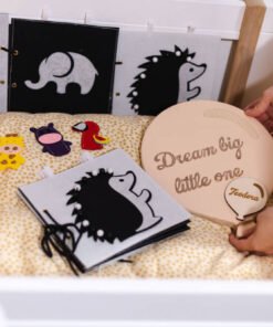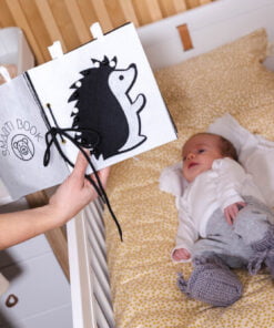 TIHÁ KNIHA BLACK AND WHITE – Obsahuje 7 stran v černobílé barevné kombinaci, a proto ji můžeme také nazvat knihou kontrastů, které novorozenci nejprve rozeznávají. Zpočátku novorozenci rozlišují mezi světlým a tmavým, také se naučí, jak se zaměřit a udržet svůj pohled na určitém předmětu. Věděli jste, že čím přesnější vizuální informace novorozenci dostanou, tím více se budou vyvíjet jejich mozkové schopnosti. Proto se doporučuje, aby bylo dětské prostředí od narození plné černobílých kontrastů, takže dítě dostane již brzy signály z prostředí, které podpoří jeho kognitivní vývoj. Kontrastní knížka BLACK AND WHITE je tak skvělým nápadem pro první dětskou hračku. Více si přečtěte ZDE.