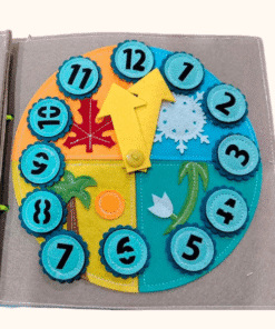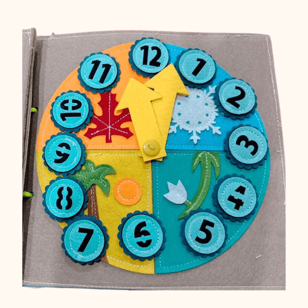 Hodiny: Dítě pohybem ručiček zkoumá čas a spojuje různé části dne. Čísla na suchý zip pomáhají při třídění a rozpoznávání čísel. Barevný kruh se symboly ročních období učí dítě změnám v přírodě během roku. Stránka rozvíjí jemnou motoriku, logické myšlení a první porozumění času.