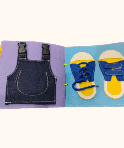 Kalhoty a boty: Zapínání a zavazování pro malé šikuly. Na levé straně dítě objevuje džínové kalhoty se dvěma klik-sponami, které může otevřít a zapnout jako skutečné kalhoty. Posiluje tím prsty, přesnost i samostatnost. Na pravé straně čekají dvě boty — jedna s klasickými tkaničkami, druhá s jednoduchým suchým zipem. Dítě si trénuje zavazování, provlékání a zapínání, jako by se chystalo na vycházku. Stránka podporuje jemnou motoriku, trpělivost i radost z úspěchu, když se dítěti podaří „obout“ svůj pár bot.
