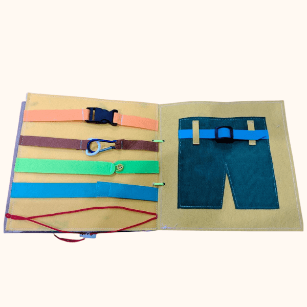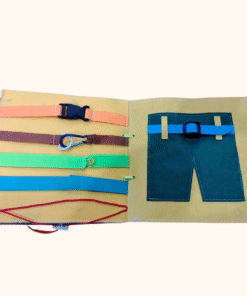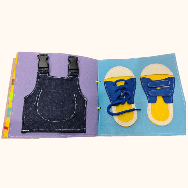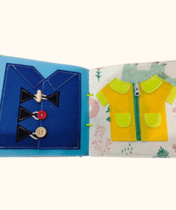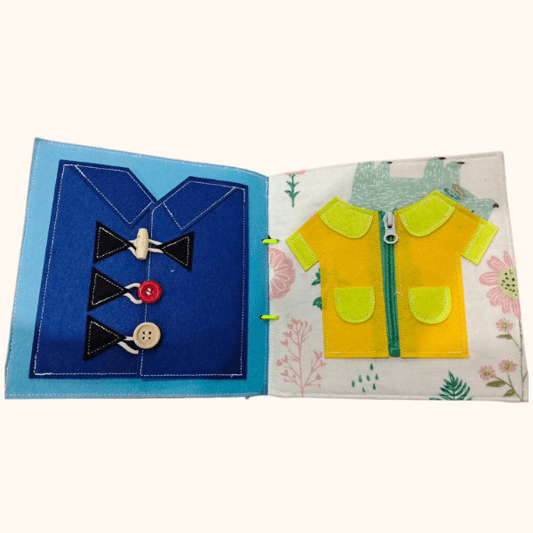 Oblékání: Knoflíky, spony a zip pro šikovné ruce. Na těchto dvou stranách dítě objevuje každodenní rutinu oblékání formou hry. Na levé straně zkouší košili s různými typy zapínání, kde si procvičí knoflíky i sponu. Na pravé straně je barevná bunda na zip, kterou může otevírat a zavírat a trénovat tak jednu z nejdůležitějších dovedností při samostatném oblékání. Stránka podporuje samostatnost, jemnou motoriku i hrdost, když dítě zvládne zapnout „skutečný“ kus oblečení.