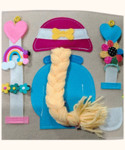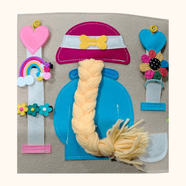 Účes a ozdoby: Zapínání, rozepínání a provlékání. Tato stránka nabízí mnoho úkolů, které podporují jemnou motoriku, koordinaci rukou i prstů a přesnost pohybů. Dítě zkouší různé typy zapínání (knoflíky, suchý zip, spony), přesouvá ozdoby a manipuluje s měkkým copem, který může rozplétat a znovu splétat. Tyto aktivity posilují svaly ruky, rozvíjejí obouruční koordinaci a pomáhají s přípravou na samostatné oblékání i budoucí grafomotoriku. Stránka podporuje také kreativitu, protože si dítě samo volí, jak prvky uspořádá a zkombinuje.