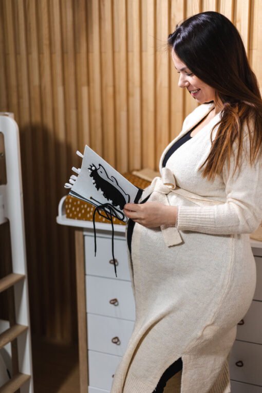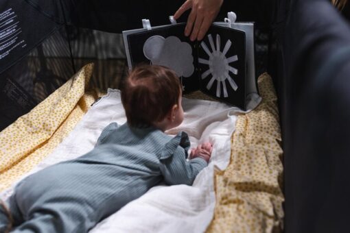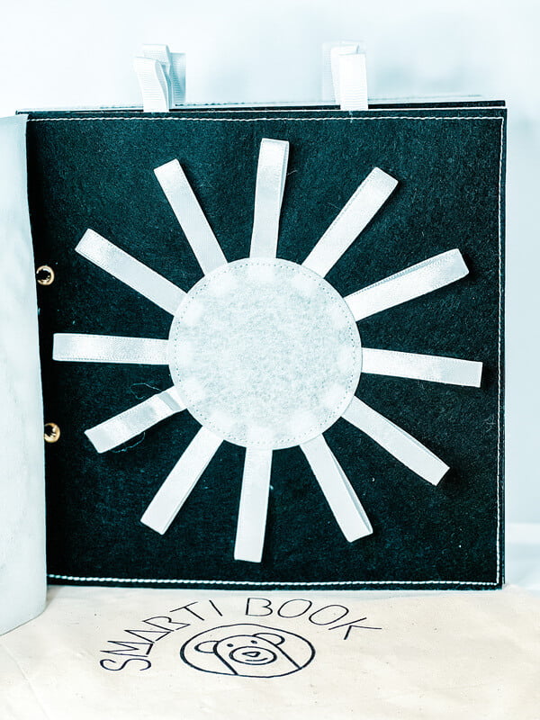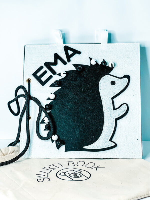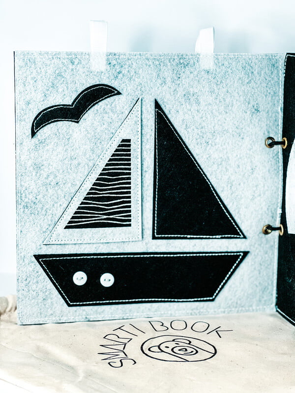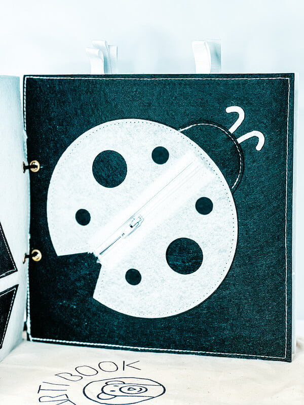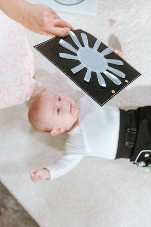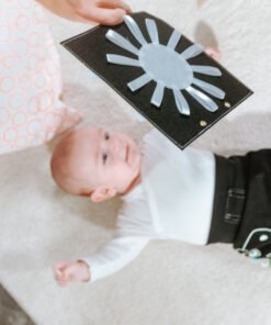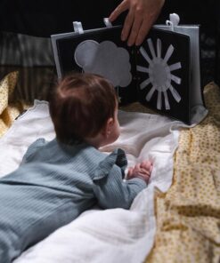 trasting ČERNOBÍLÁ knížka je výborný nápad na první hračku miminka. Všechny stránky brožury jsou odnímatelné a lze je zavěsit vodorovně na postýlku nebo podložku na hraní, na kočárek nebo jednoduše samostatně připevnit v autě. Brožura obsahuje různé obrázky zvířat a předmětů. Každá stránka obsahuje několik různých materiálů, kterých se dítě může dotknout, čímž se rozvíjí smyslová integrace. Navrhli jsme brožuru pro novorozence, abychom podpořili jejich smyslový a zrakový vývoj pomocí kontrastních obrázků. Děti si během vývoje nesmírně užívají objevování nových obrázků a materiálů.