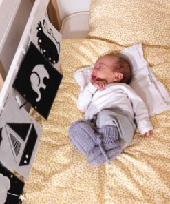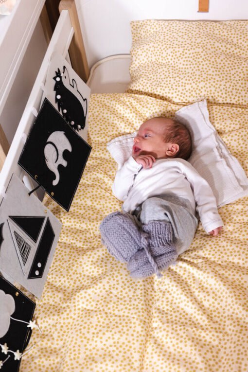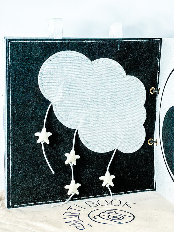 CLOUD: Obláček je skvělý na dotek, jelikož má přes filc našitou síťku, která navíc vydává pro novorozence velmi příjemný zvuk (podobný šustění). Navíc z oblaku visí provázky s hvězdami. Miminko si kromě pozorování může všeho také osahat.