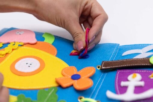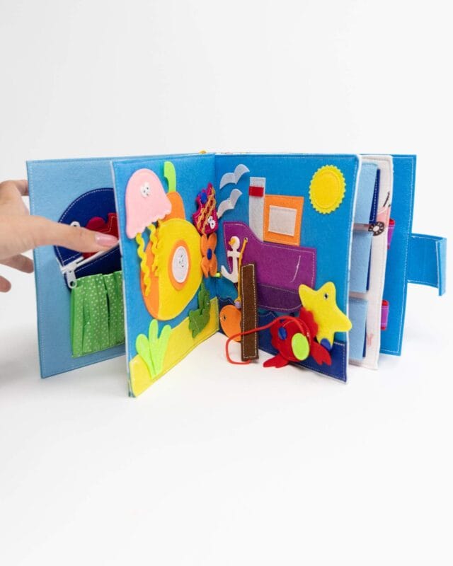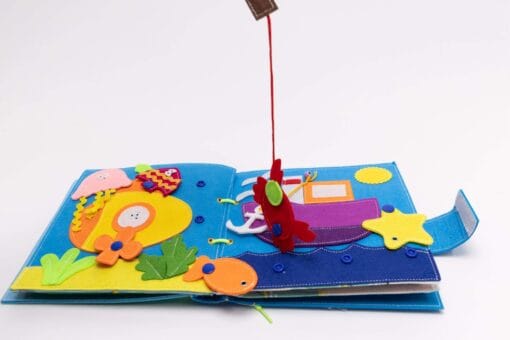 Tichá kniha Podvodní dobrodružství děti jemně vede k pozorování přírody, objevování různých tvarů a textur a přirozeně je vtahuje do světa fantazie. Pomocí aktivit jako je vkládání rybičky do pelikánova zobáku, provlékání šňůrek skrz bludiště nebo překonávání překážek si dítě rozvíjí jemnou motoriku, koordinaci a schopnost řešit úkoly.