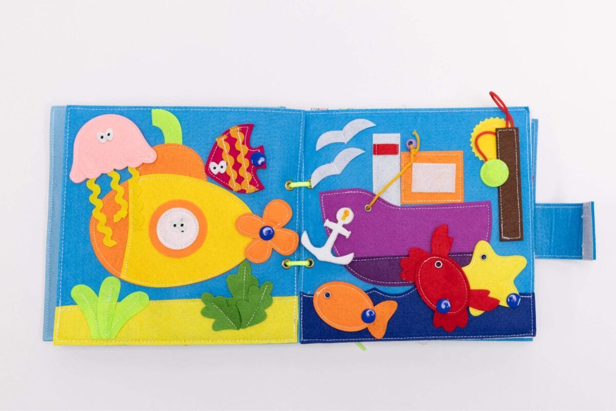 Obsahuje 9 herních stránek a sadu dětských prstových loutek. Je vhodná pro děti od 2 let, protože je navržena tak, aby podporovala zvídavost, objevování podmořského světa a tvorbu vlastních příběhů. V knize dítě potkává různé mořské živočichy a rostliny, učí se je pojmenovat, třídit a zkouší si své dovednosti v hrách jako je krmení pelikána, objevování velryby, plavba ponorkou, chytání rybiček, výroba zmrzliny nebo hra pexeso.