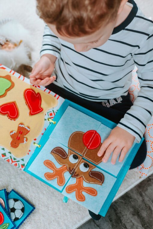 Sestav stromeček: Sestav puzzle a dostaneš stromeček. Na knoflíky šikovně zavěs ozdoby a stromeček bude připraven. Pod stromeček můžeš také umístit dárky.