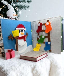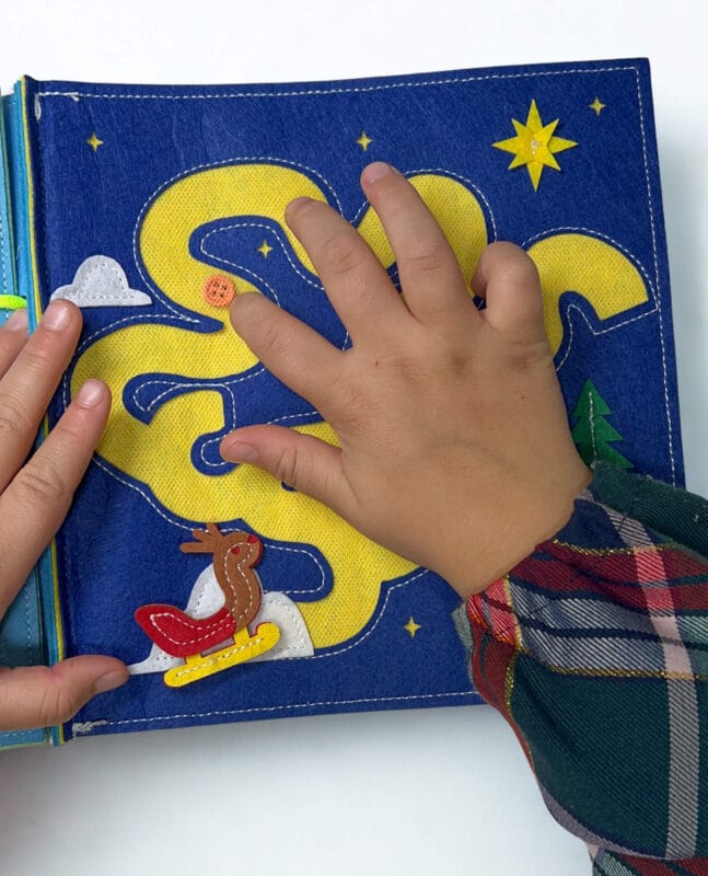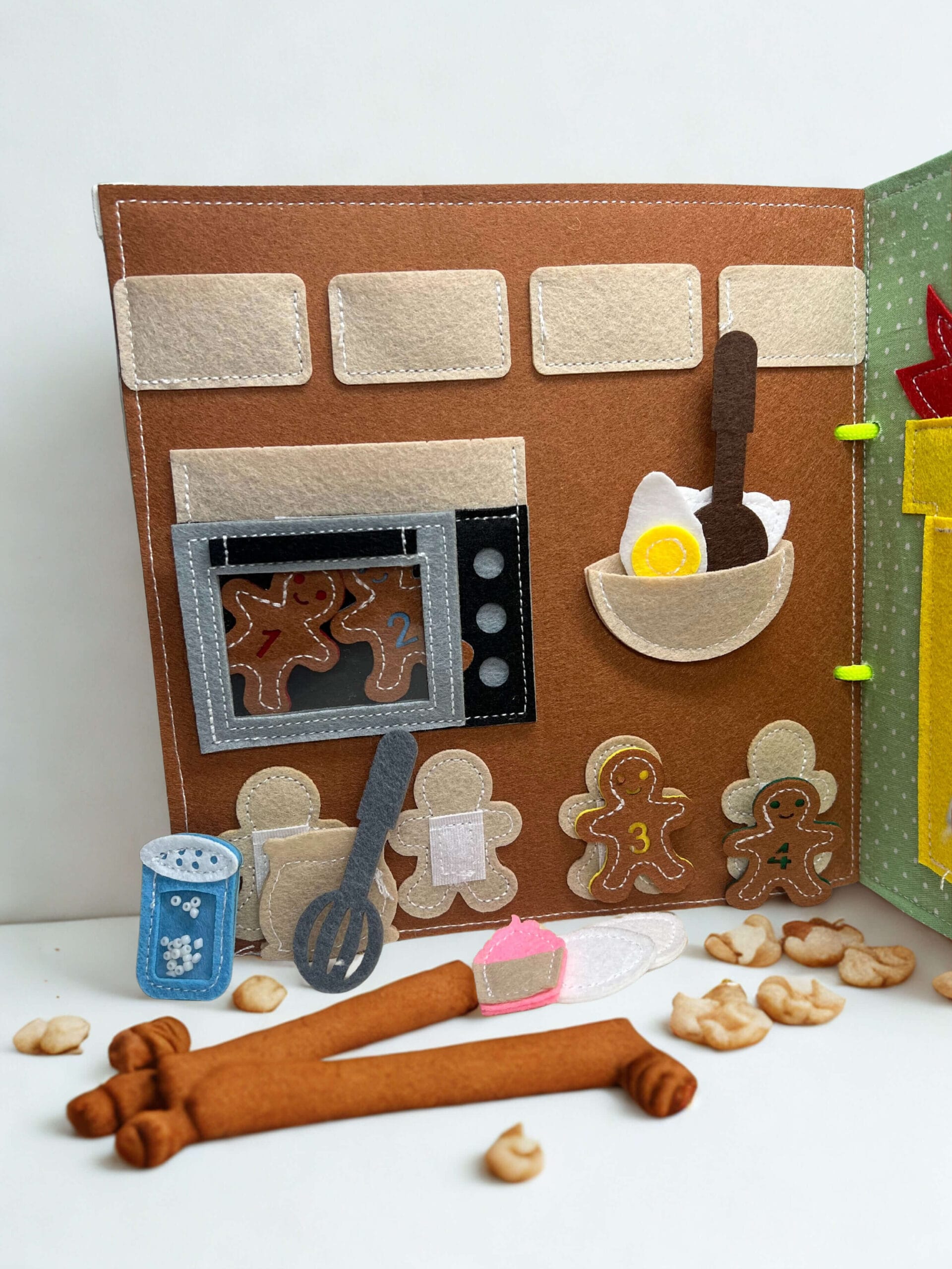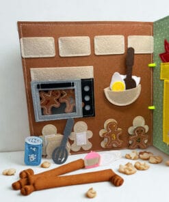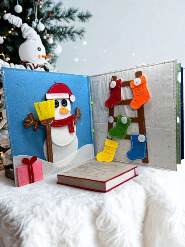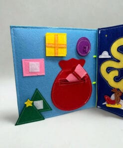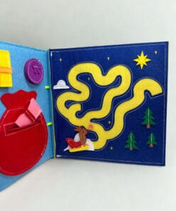 Zimní tichá kniha obsahuje 7 aktivitových stran, které jsou tematicky propojené s Vánocemi a zimním obdobím. Je vhodná od 2 let a nabízí dětem pestrou škálu činností: třídění barev, připínání a zapínání, zavazování, přesouvání figurek po cestě, hraní rolí při pečení sušenek a rozpoznávání základních tvarů.
