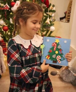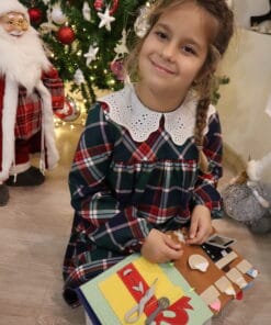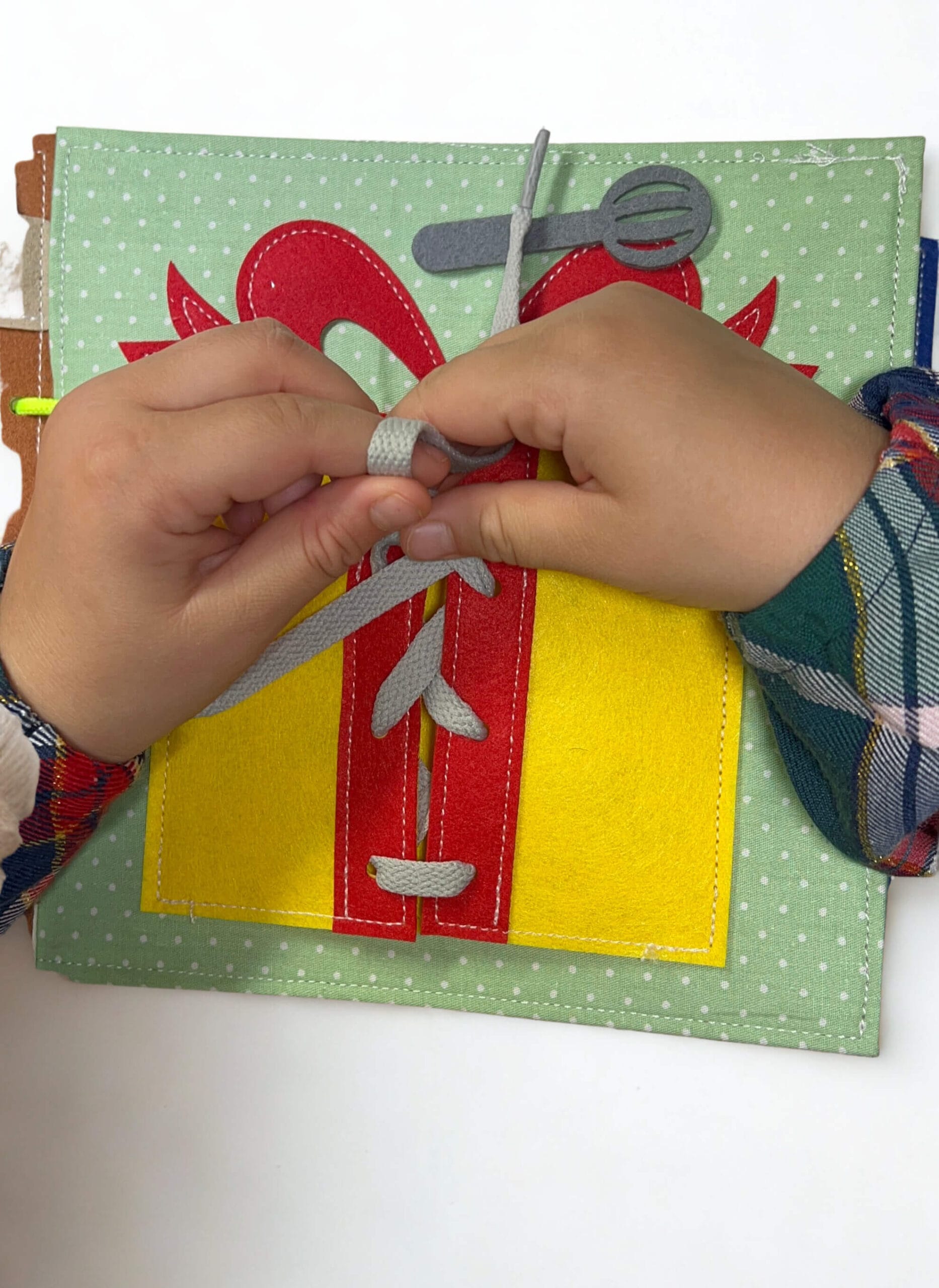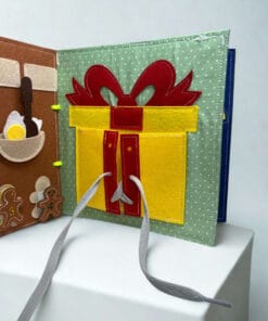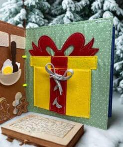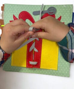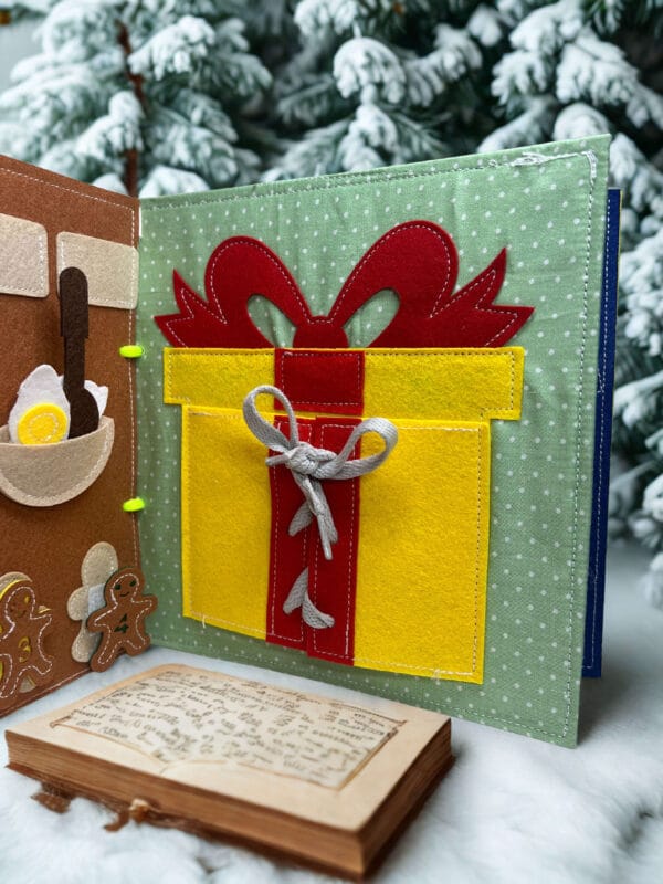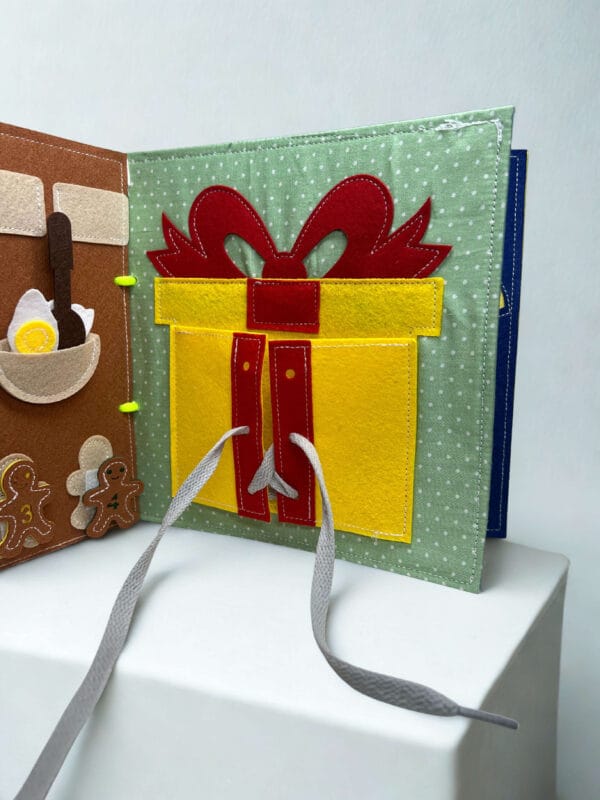 Velký dárek s tkaničkou: Pátou stránku tvoří velký vánoční dárek, který je potřeba rozvázat a znovu zavázat. Je to ideální cvičení pro učení zavazování a rozvoj jemné motoriky. Dítě pomocí tkaničky spojuje stužky, odhalí překvapení uvnitř a tím posiluje svou samostatnost a zručnost.