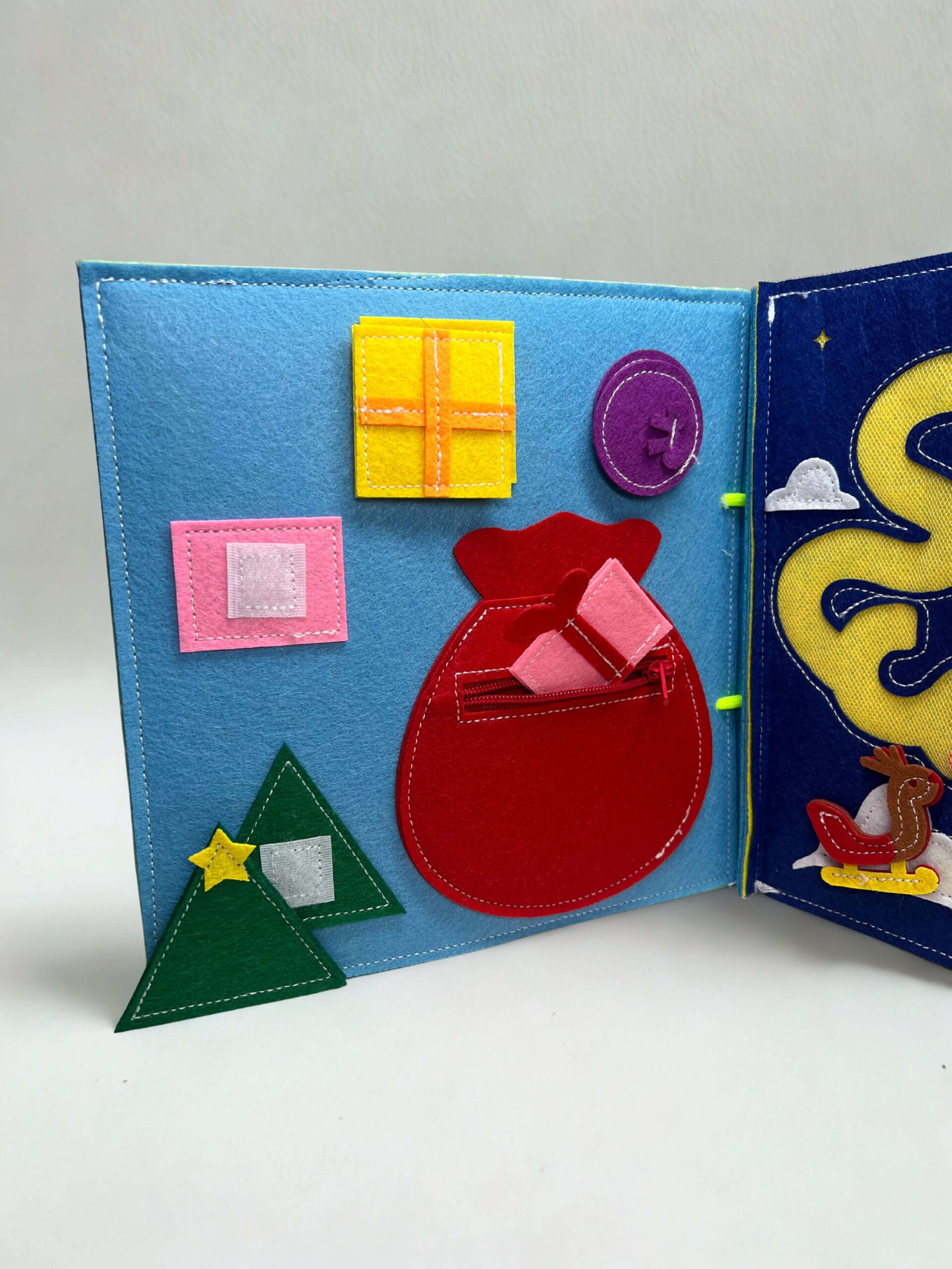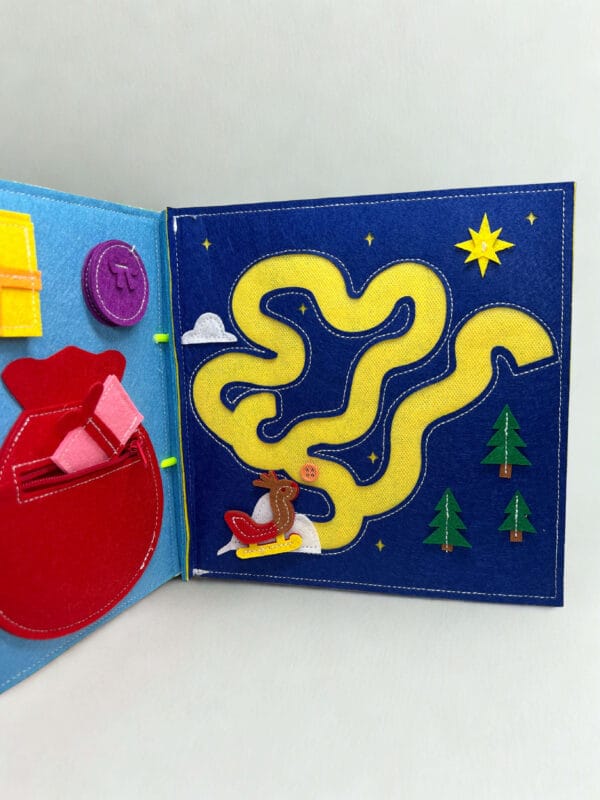 Pytel s dárky a tvary: Na šesté stránce se nachází červený vánoční pytel na zip, ve kterém jsou ukrytá menší dárky a různé tvary. Dítě pytel otevírá a zavírá, třídí dárky a poznává různé tvary i barvy, které poté opět ukládá do pytle. Stránka rozvíjí logické myšlení, vnímání tvarů a dovednost zapínání zipu.