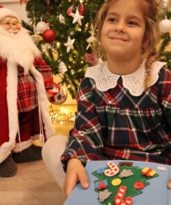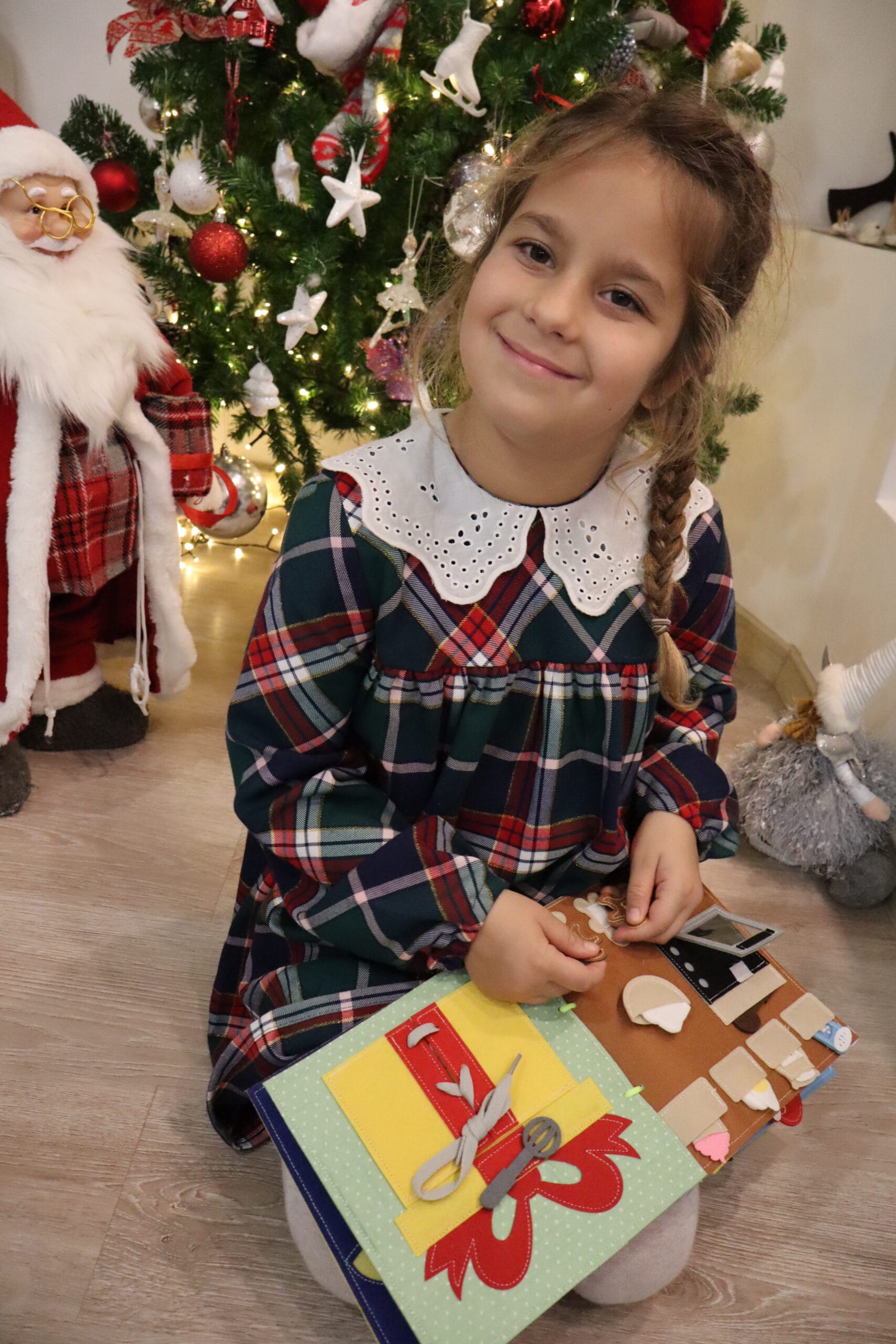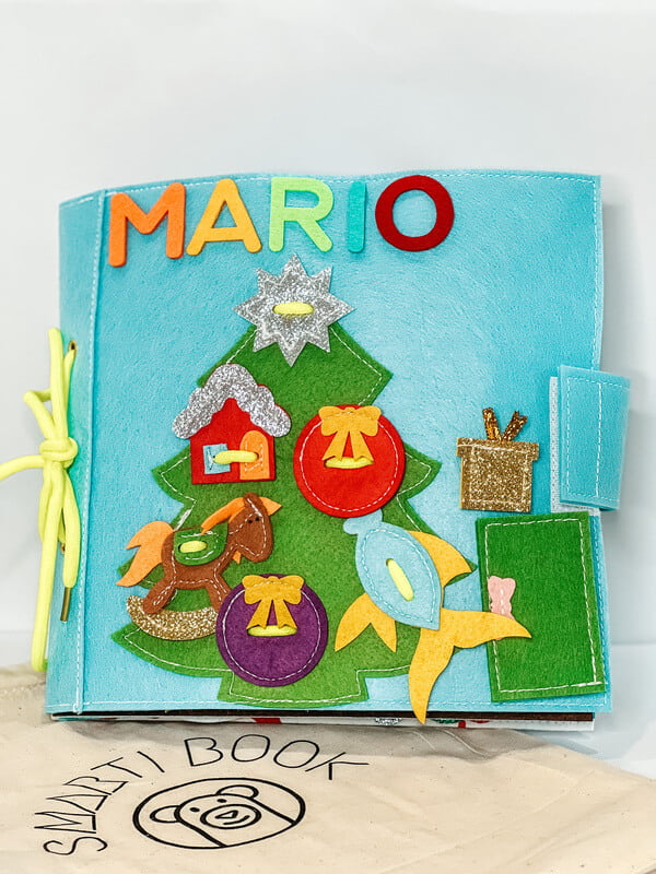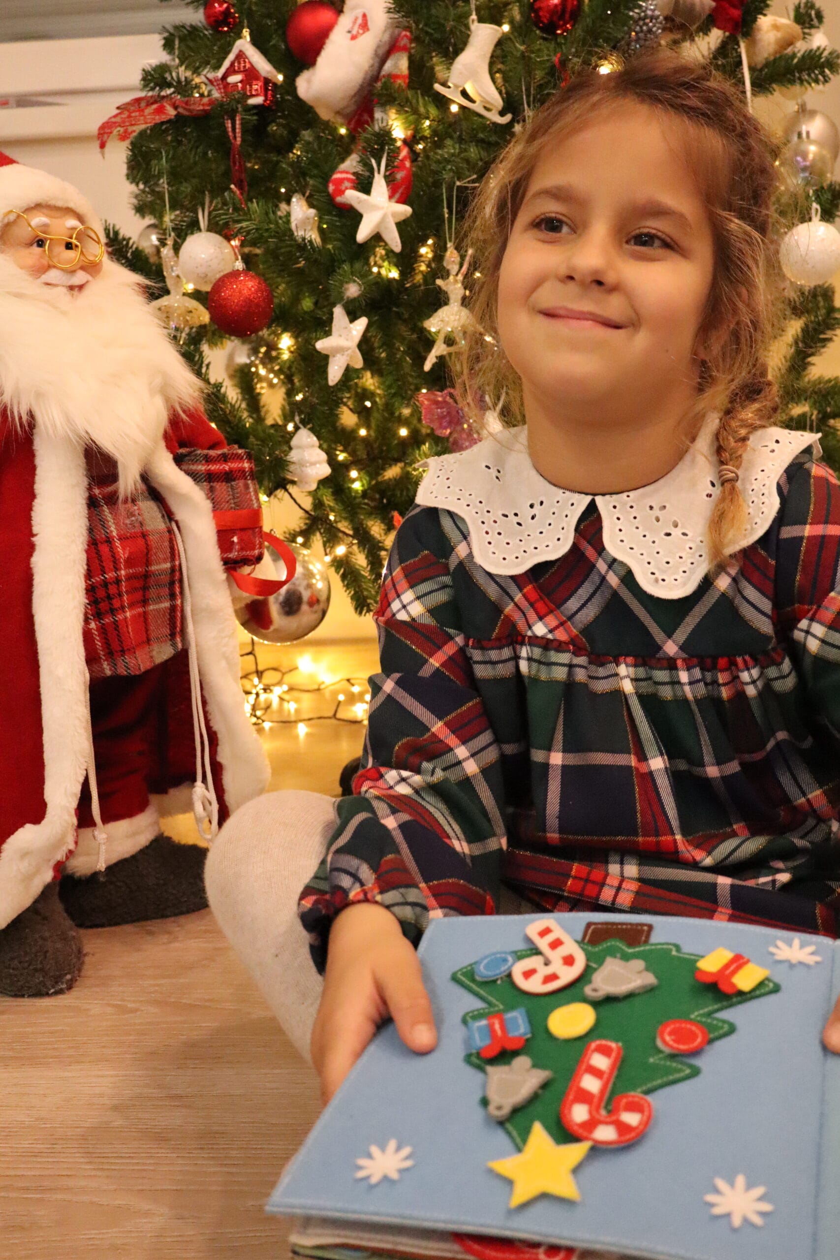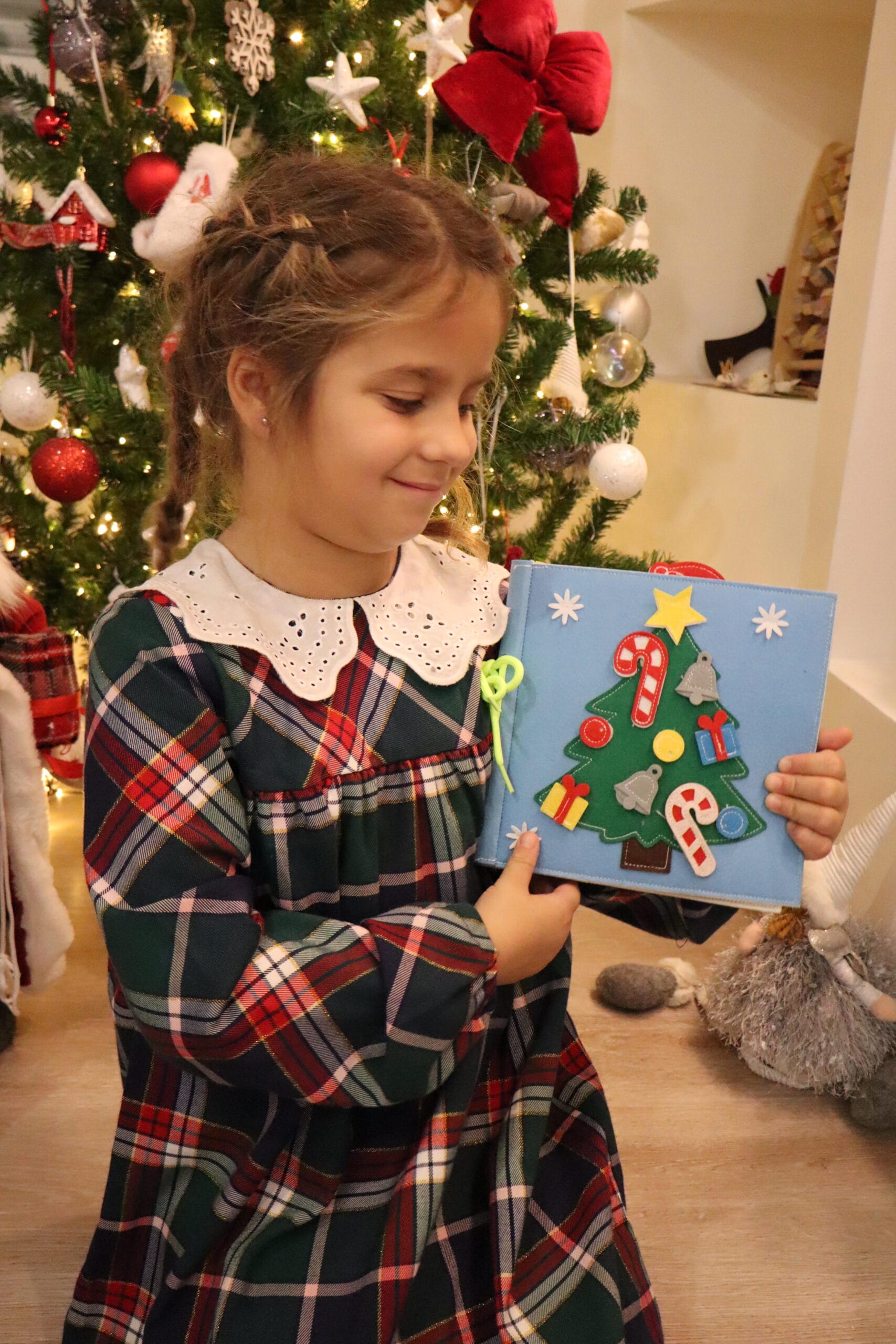 Vánoční stromeček s ozdobami: Na první stránce dítě zdobí vánoční stromeček různými ozdobami na suchý zip. Při tom si procvičuje rozpoznávání barev a tvarů, zároveň trénuje přesnost i koordinaci prstíků. Ozdoby může libovolně přemísťovat a vytvořit si vlastní sváteční dekoraci.